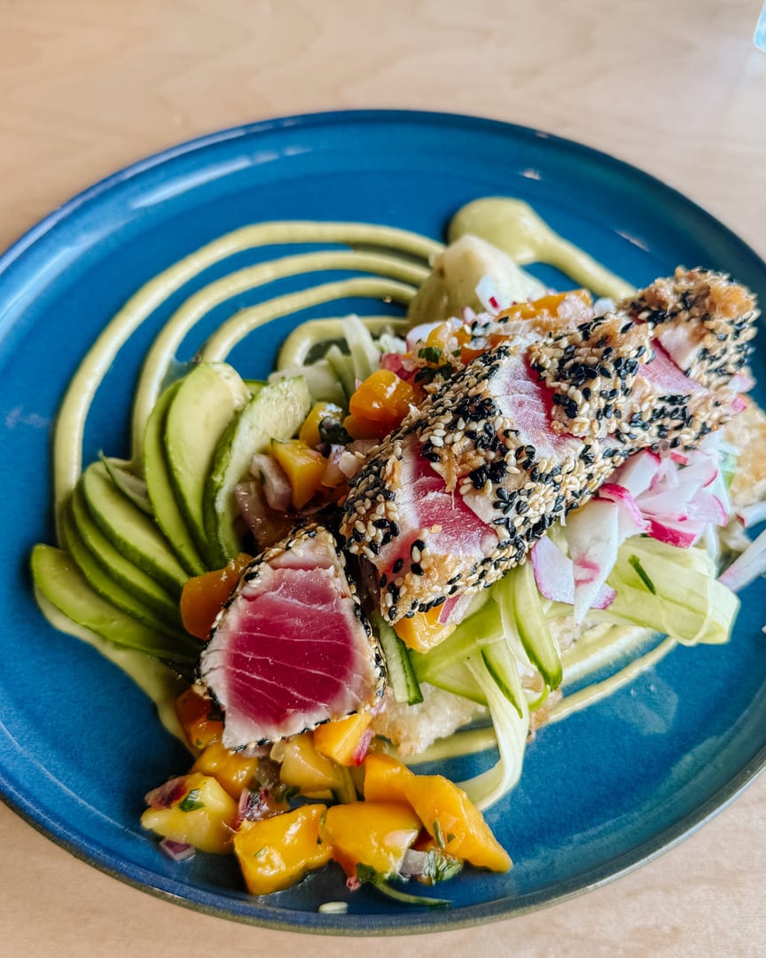 Crispy rice, sushi tuna or Korean fried shrimp, mango salsa, cucumber, avocado, radish, green onion, braised bok choy with wasabi dashi m...